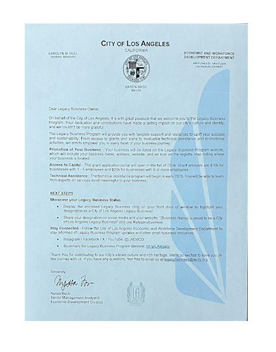 Legacy Business Recognition from the Mayor of Los Angeles